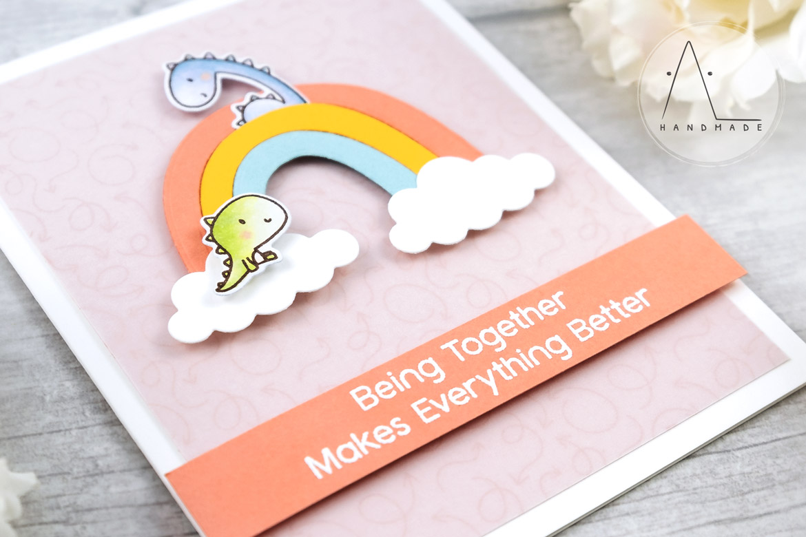 Finally, I heat embossed the sentiment in white on a strip of Coral Crush card stock and mounted it on my card along with the cute rainbow and the adorable characters, using foam tape for dimension.